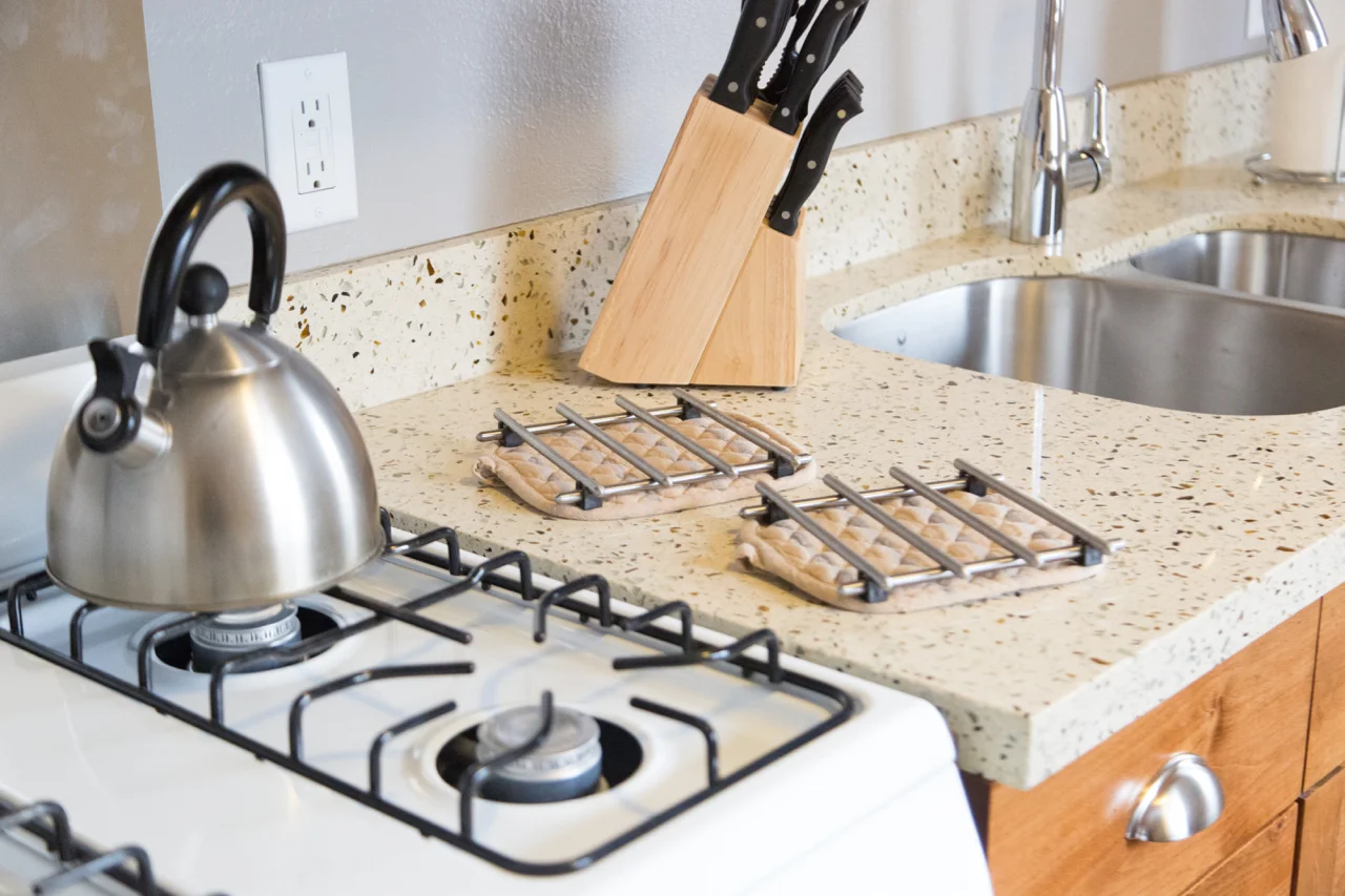 Kitchen with gas range, microwave, and refrigerator